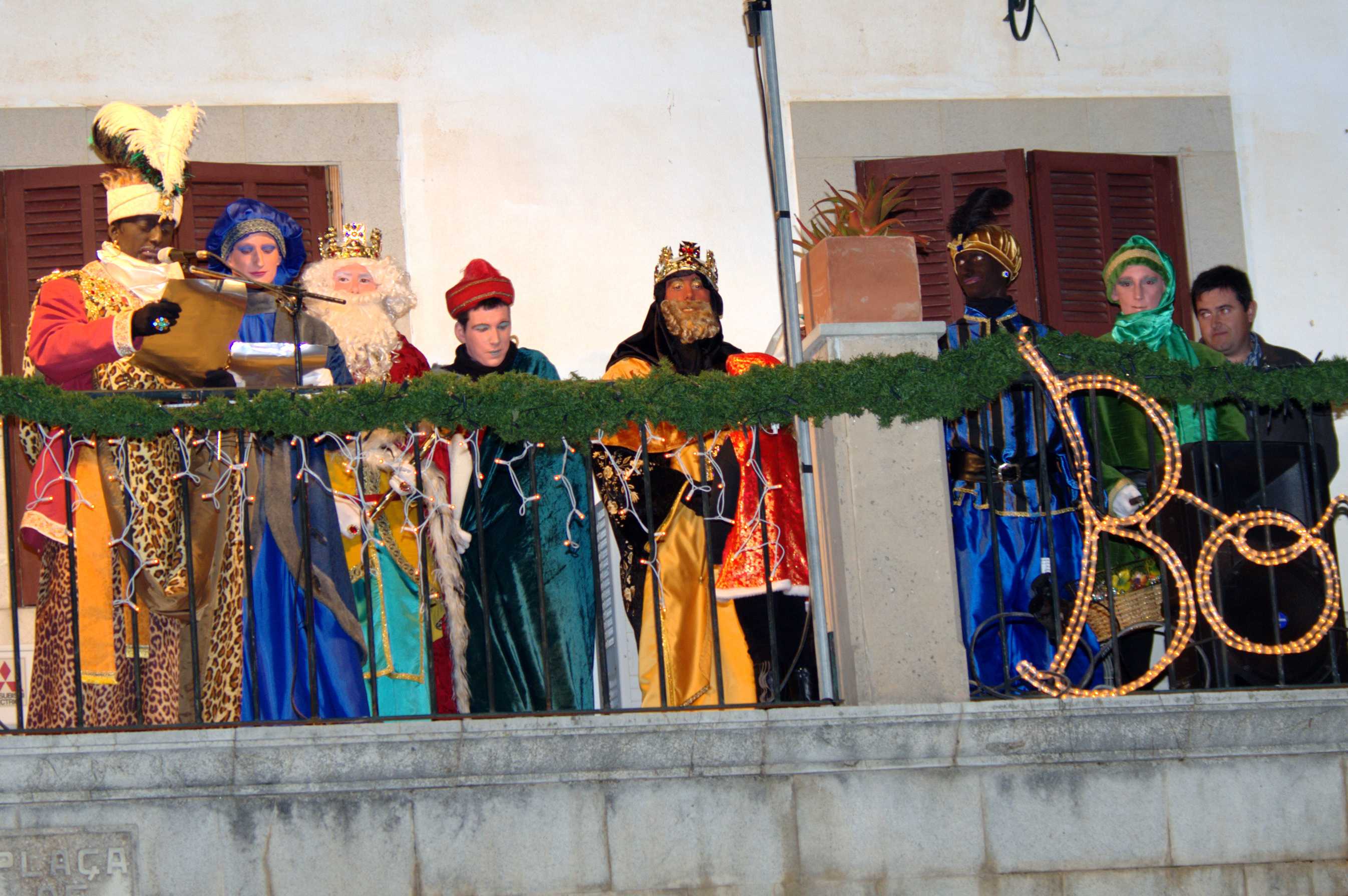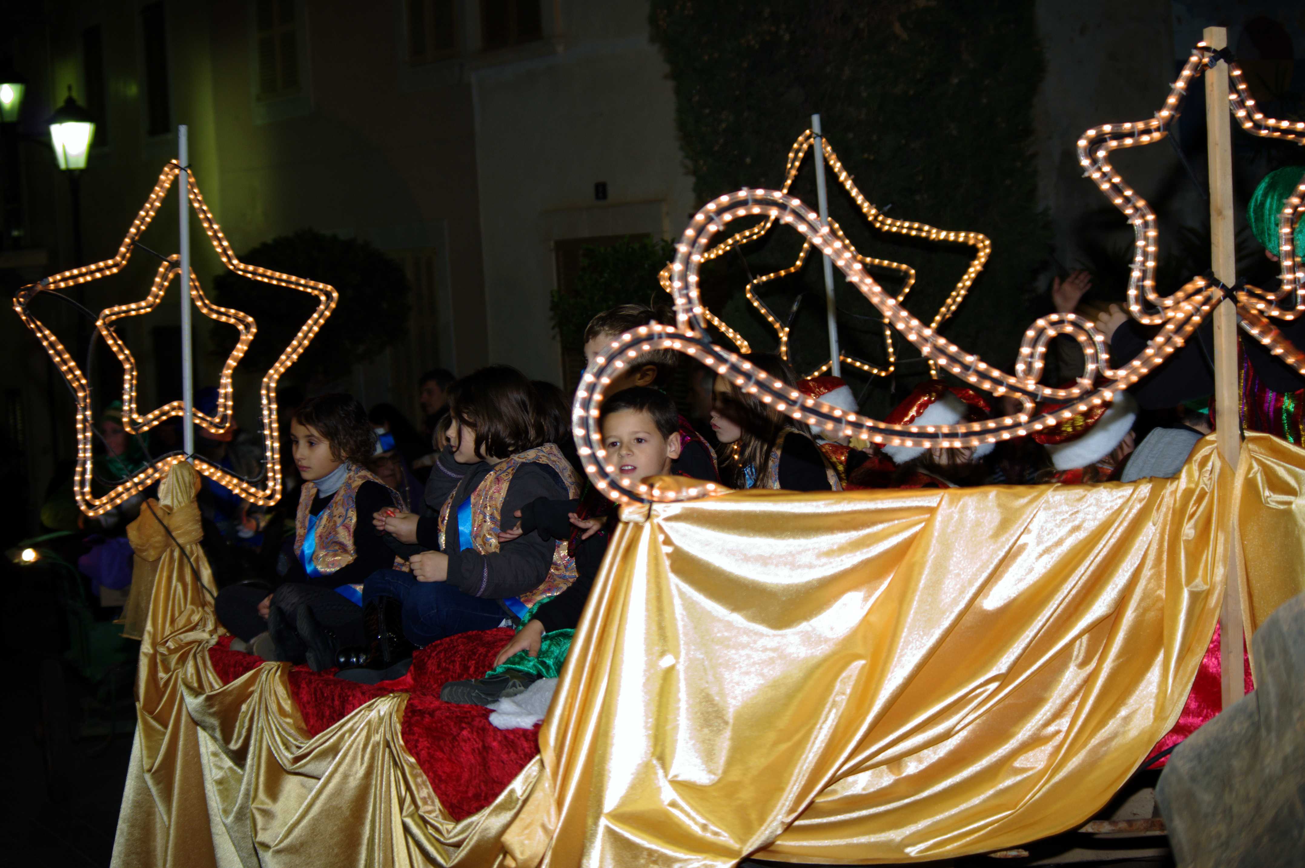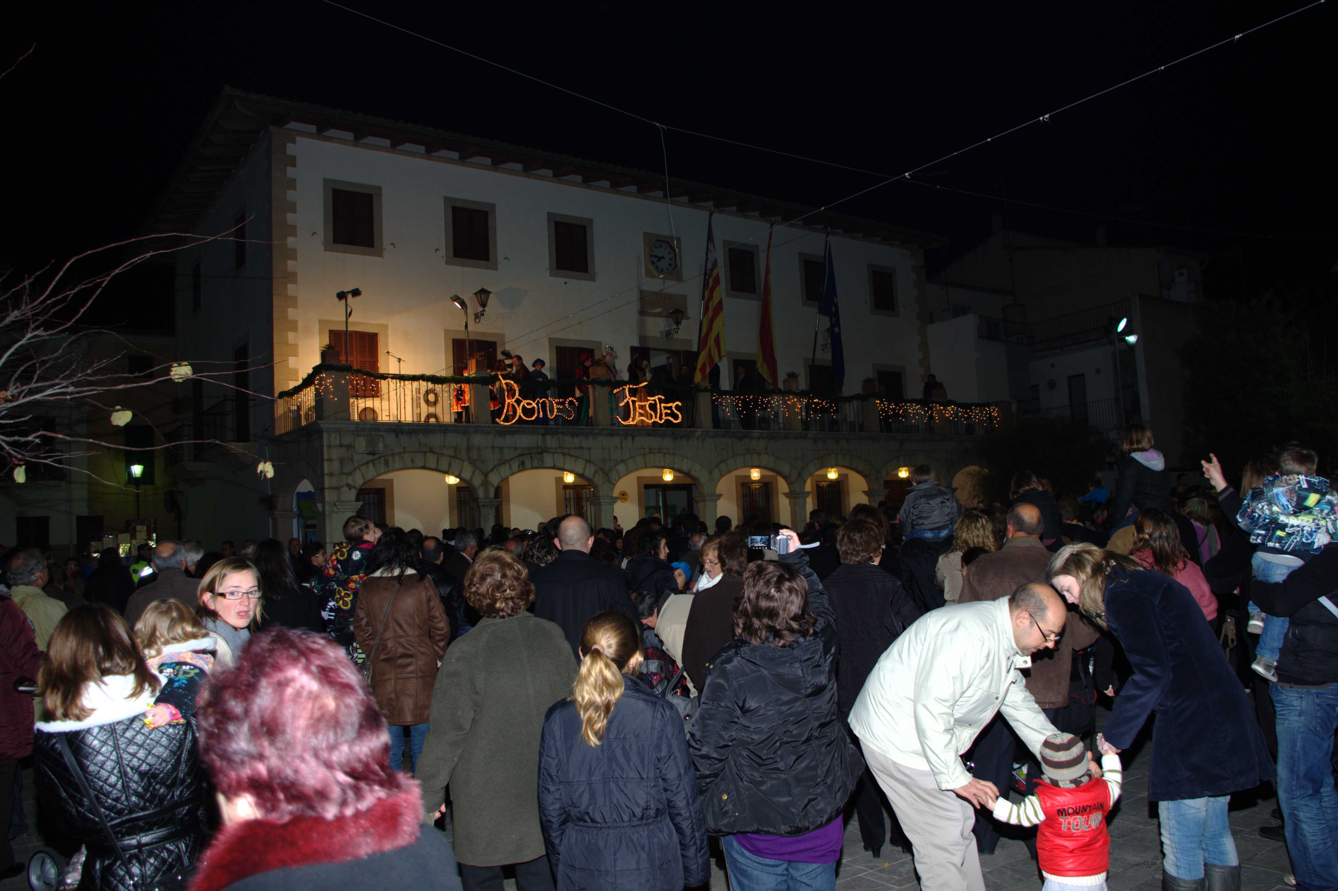 A continuació us deix les fotos del recorregut del Reis d’Orient al seu pas per Sant Llorenç. Ahir, a les set i mitja de l’horabaixa arribaren a la plaça de l’ajuntament els Reis d’Orient, precedits per una carrossa amb infants i una altra farcida de regals. Els reis qualcaven damunt uns preciosos carruatges ‘Victòria’ tirats per cavalls, mentre que l’ambaixador reial ho feia amb un carretó estirat per una somereta. Tot seguit pujaren al balcó de l’ajuntament a fer el seu discurs amb dures crítiques de cap a les retallades en matèria ecònomica i entonant un fort ‘volem català!’ fent referència a la demagògia de l’actual govern en contra de la nostra cultura.