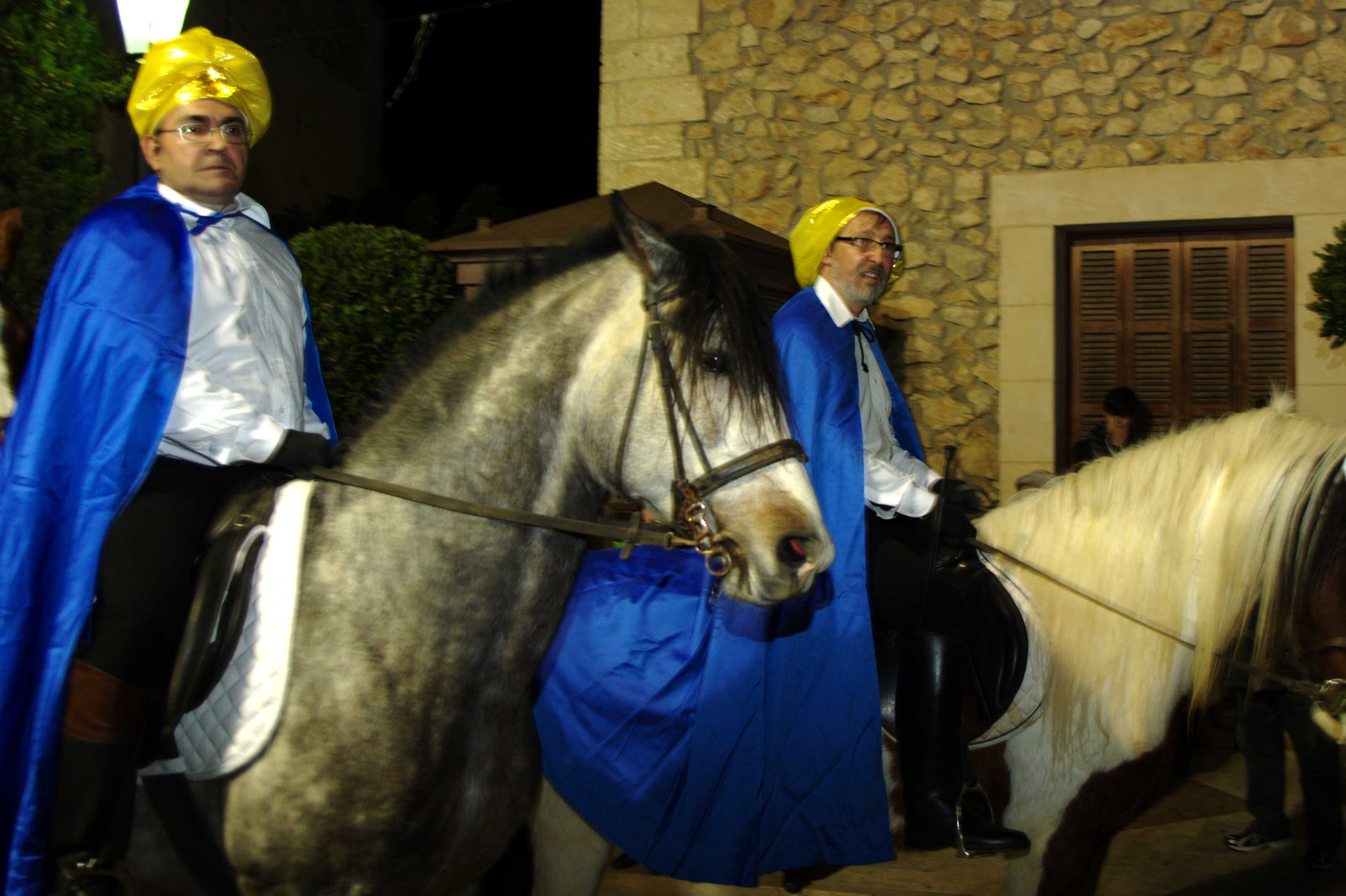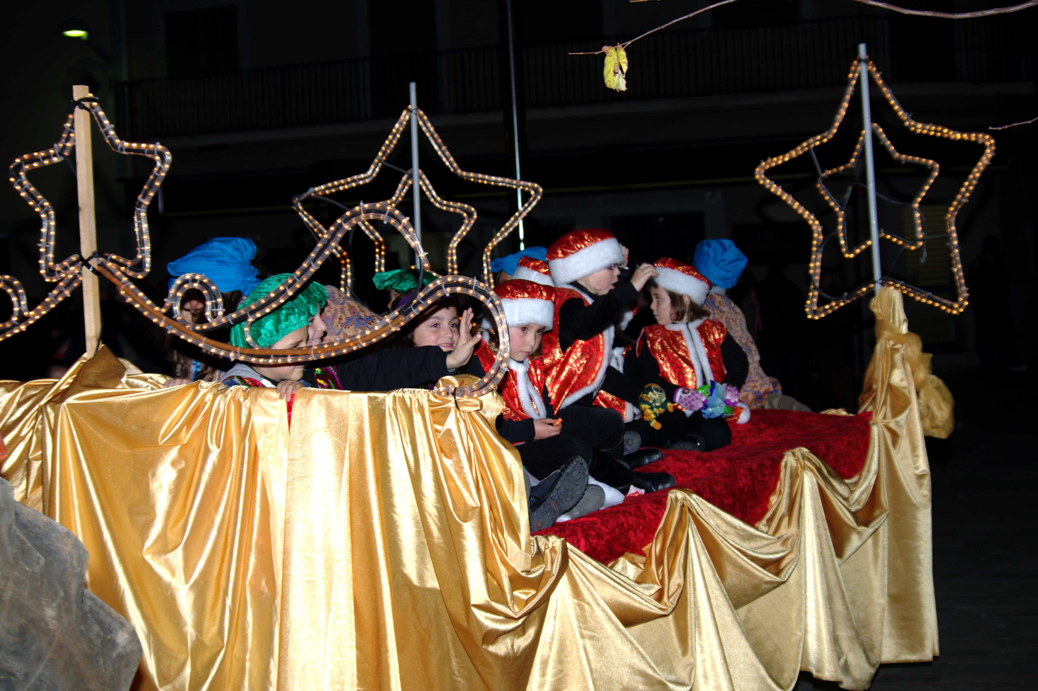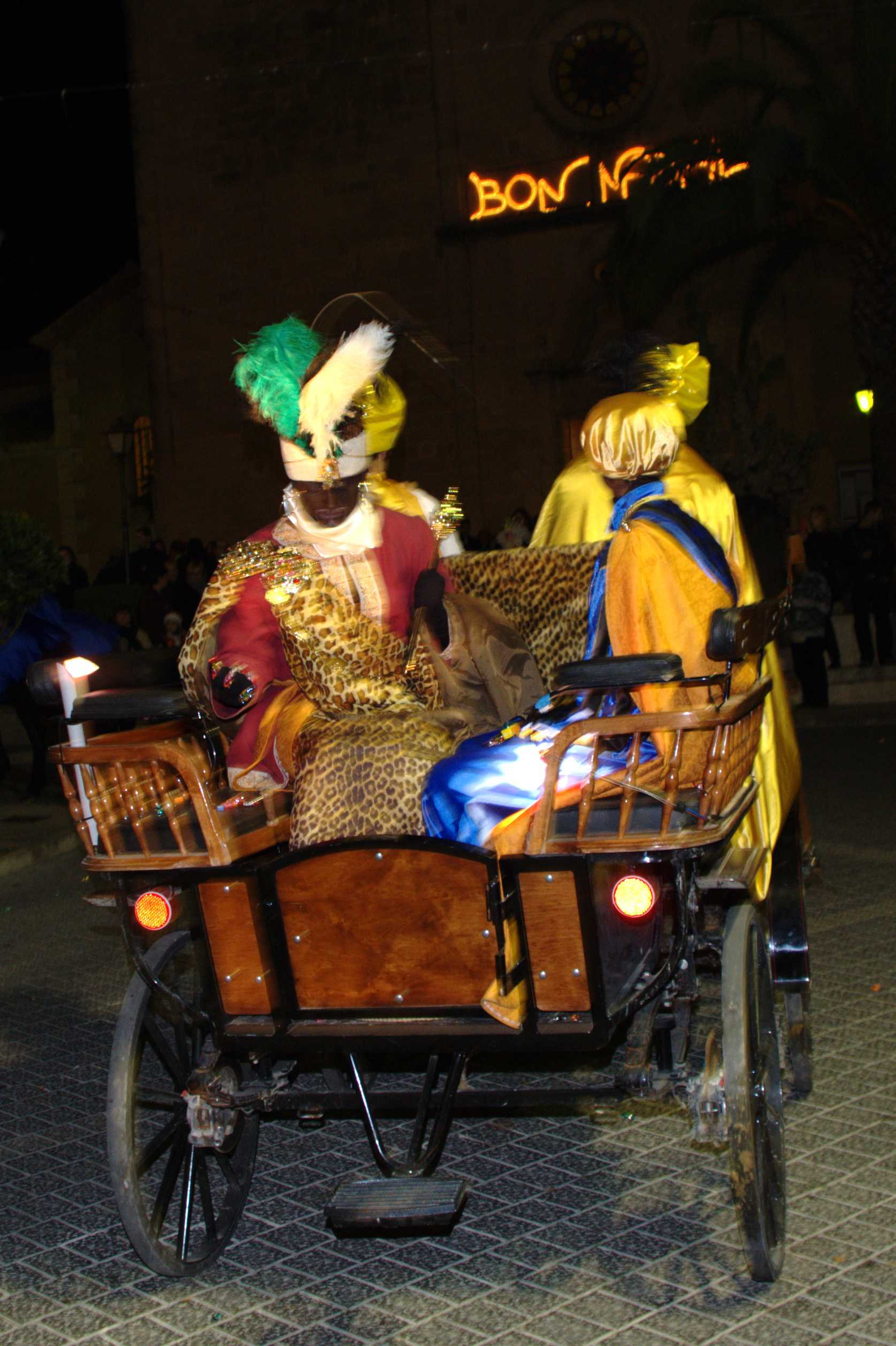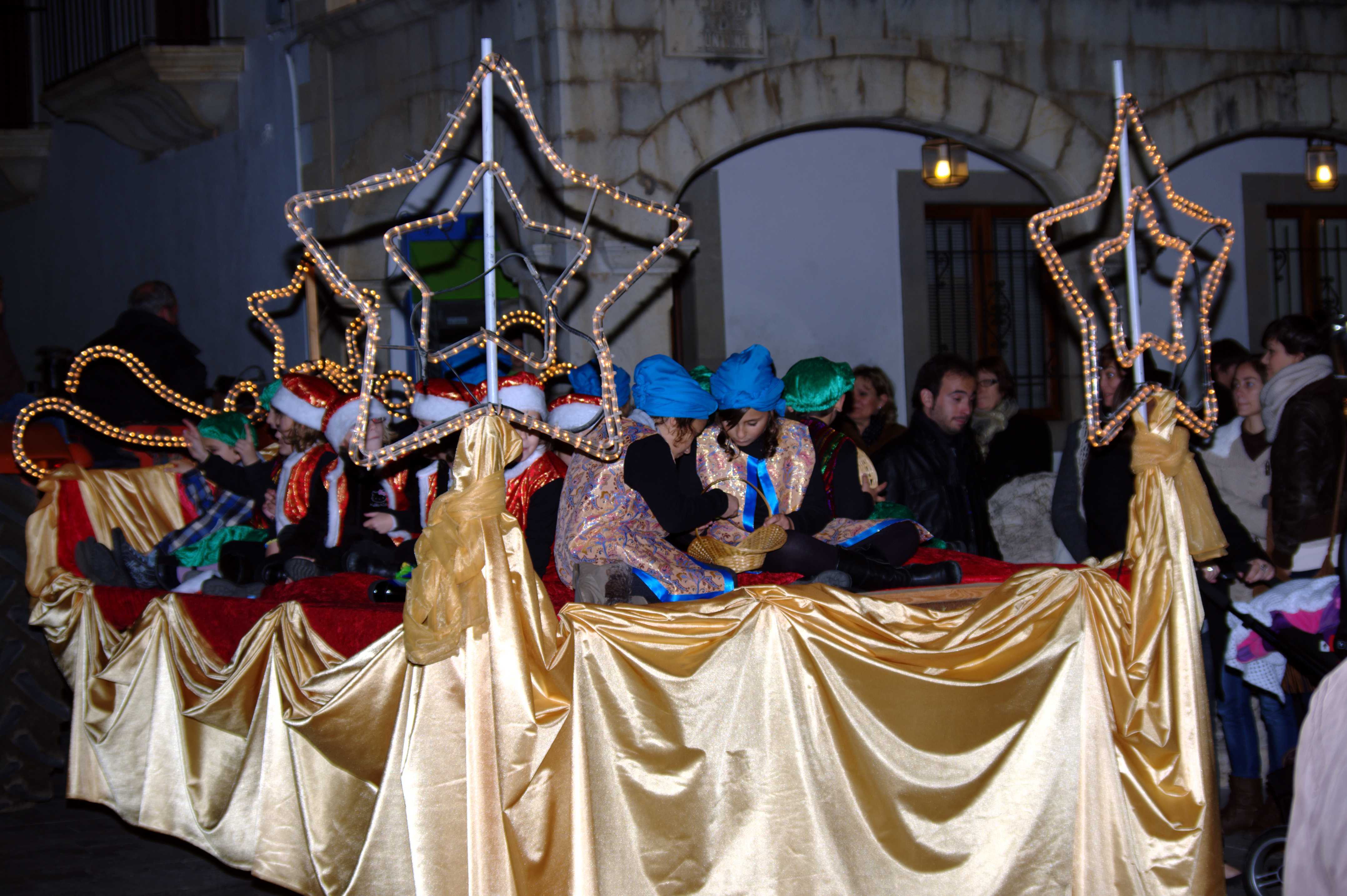 A continuació us deix les fotos del recorregut del Reis d’Orient al seu pas per Sant Llorenç. Ahir, a les set i mitja de l’horabaixa arribaren a la plaça de l’ajuntament els Reis d’Orient, precedits per una carrossa amb infants i una altra farcida de regals. Els reis qualcaven damunt uns preciosos carruatges ‘Victòria’ tirats per cavalls, mentre que l’ambaixador reial ho feia amb un carretó estirat per una somereta. Tot seguit pujaren al balcó de l’ajuntament a fer el seu discurs amb dures crítiques de cap a les retallades en matèria ecònomica i entonant un fort ‘volem català!’ fent referència a la demagògia de l’actual govern en contra de la nostra cultura.