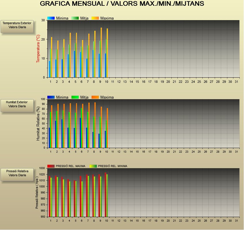 Com veieu la temperatura màxima ja s’acosta als 30 º, la mitjana de la humitat no baixa dels 60% i les pressions, que van associades al bon temps, van des 1010-1020 hPa.