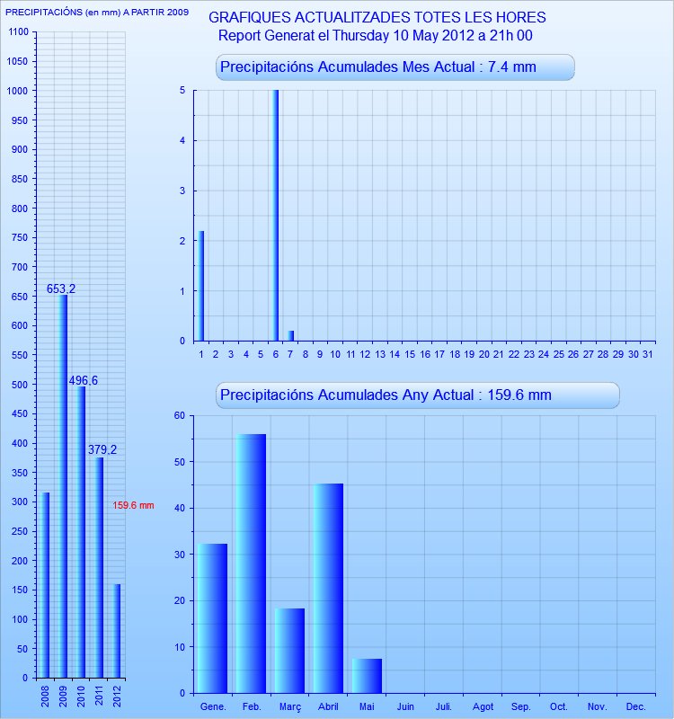 Això tan blau que us pos a continuació és la pluja caiguda. Tenim a l’esquerra de la imatge les quantitats dels anys que tinc la meva estació posada, a dalt la del mes actual i avall la que portem d’any 2012.