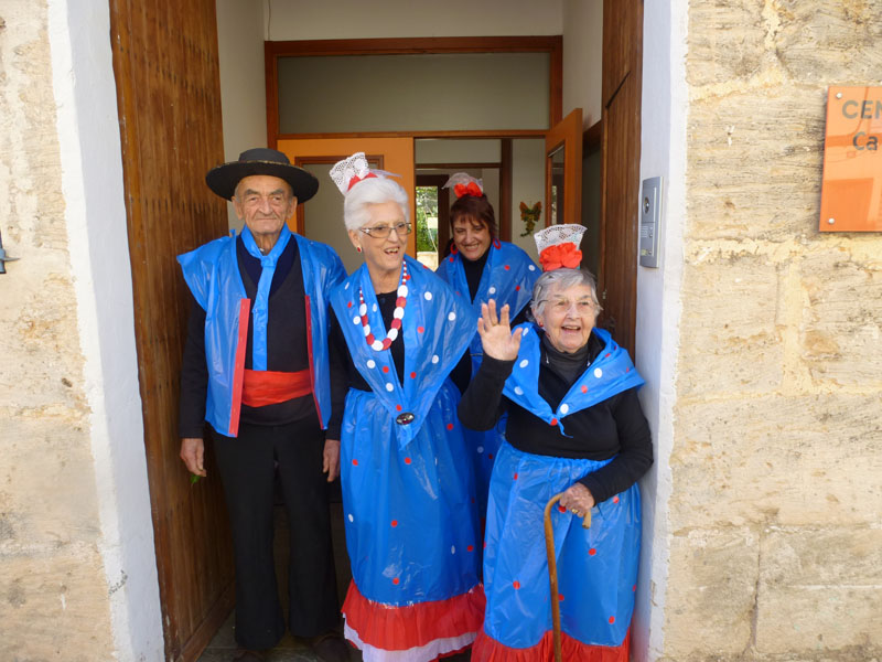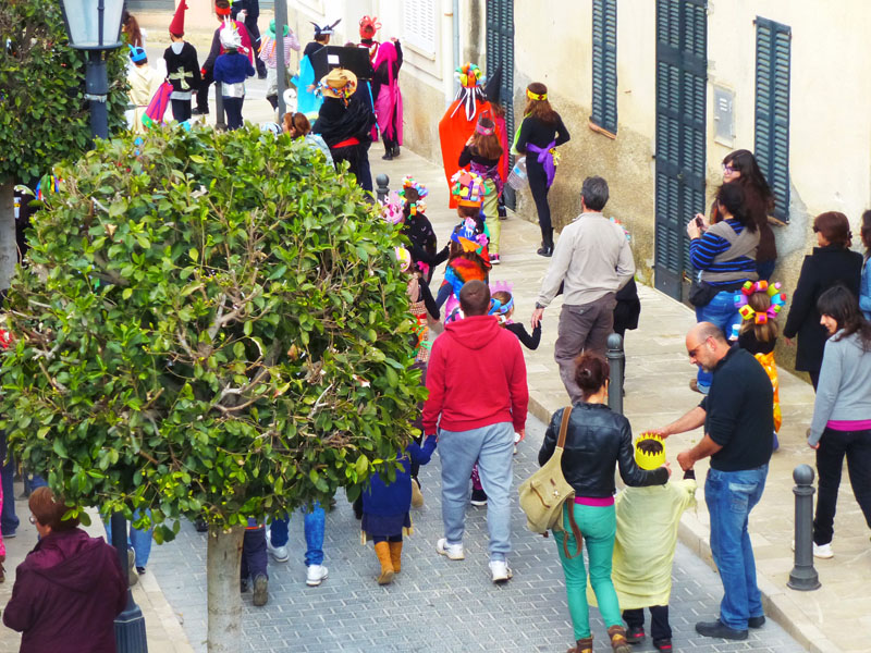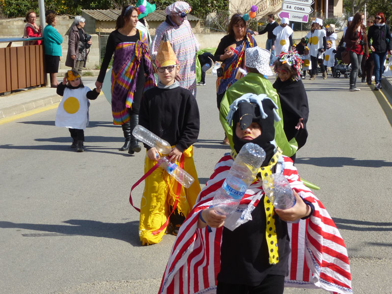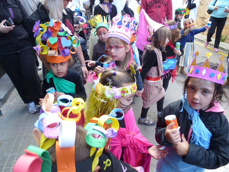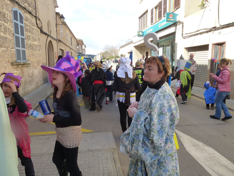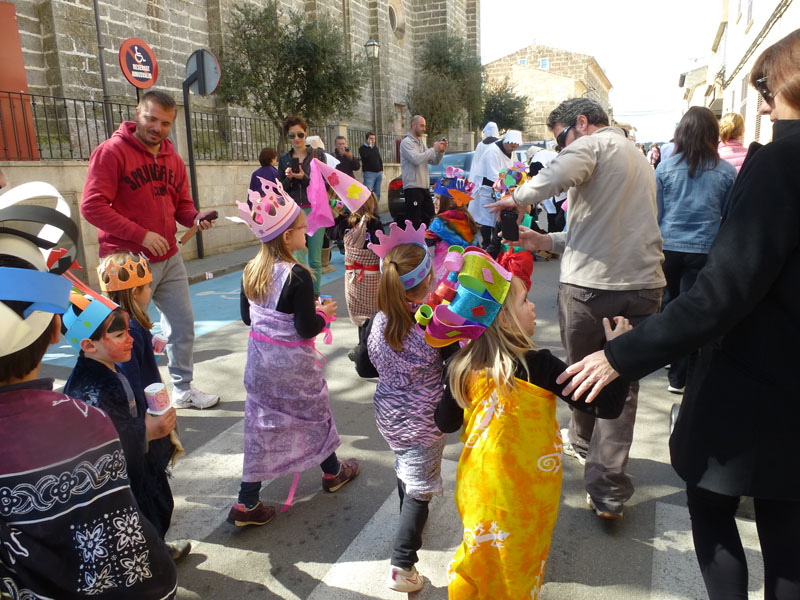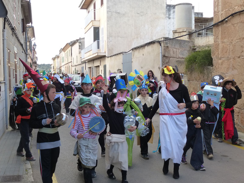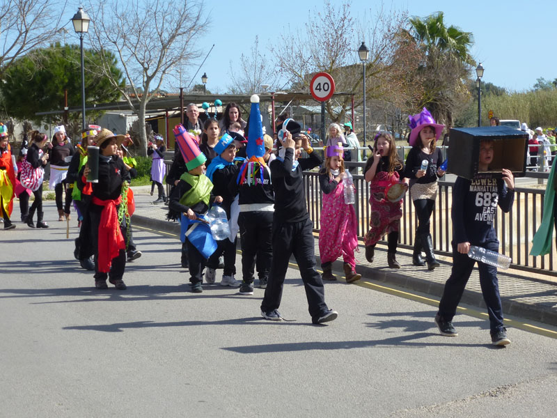 Amb la rueta ben acolorida de l’escola Sant Miquel de Son Carrió, s’han encetat les festes de carnaval d’enguany. Tots els nins i nines de primària, educació infantil i l’escoleta dels més petits han sortit disfressats amb els mestres per a celebrar el dijous jarder, darrer dijous abans de la quaresma. Renou de batucada, amb instruments fets pels nins/es, pels carrers del poble convidaven a sortir de casa a badar, els usuaris del centre de dia també han sortit disfressats i ben flamencs per animar la rueta. Amb tant de renou hi ha hagut més d’un ou romput.