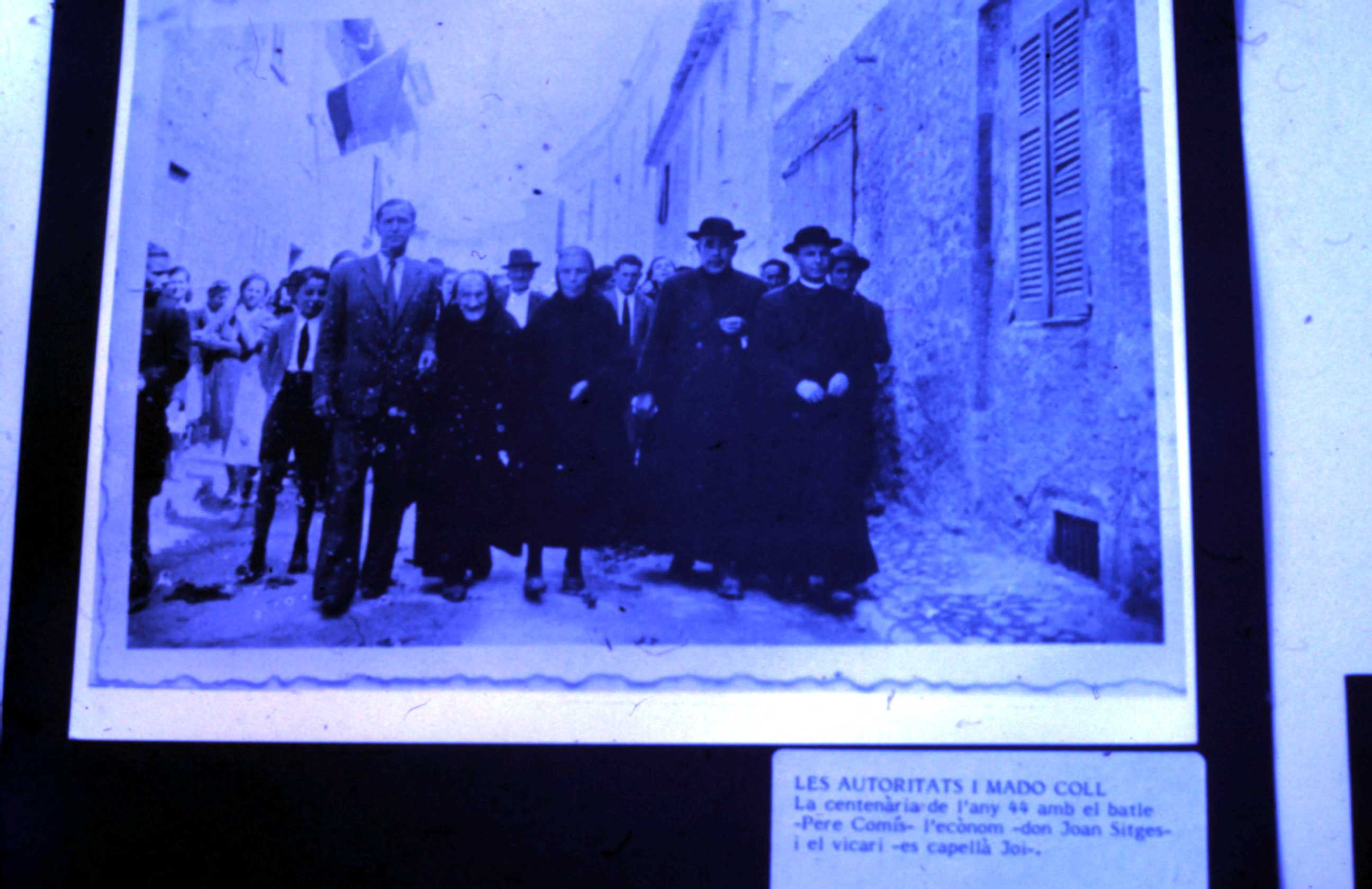 A la primera imatge d’avui veiem tot un grup de persones que celebren en processó pel carrer el centenari de madò Coll a l’any 1944. Segons resa el cartellet hi apareixen veïns del pobles, la centenària, i les autoritats en primera línia: el batle Pere Comís, que casualment és el meu padrí; l’ecònom don Joan Sitges; i el vicari Joi.
