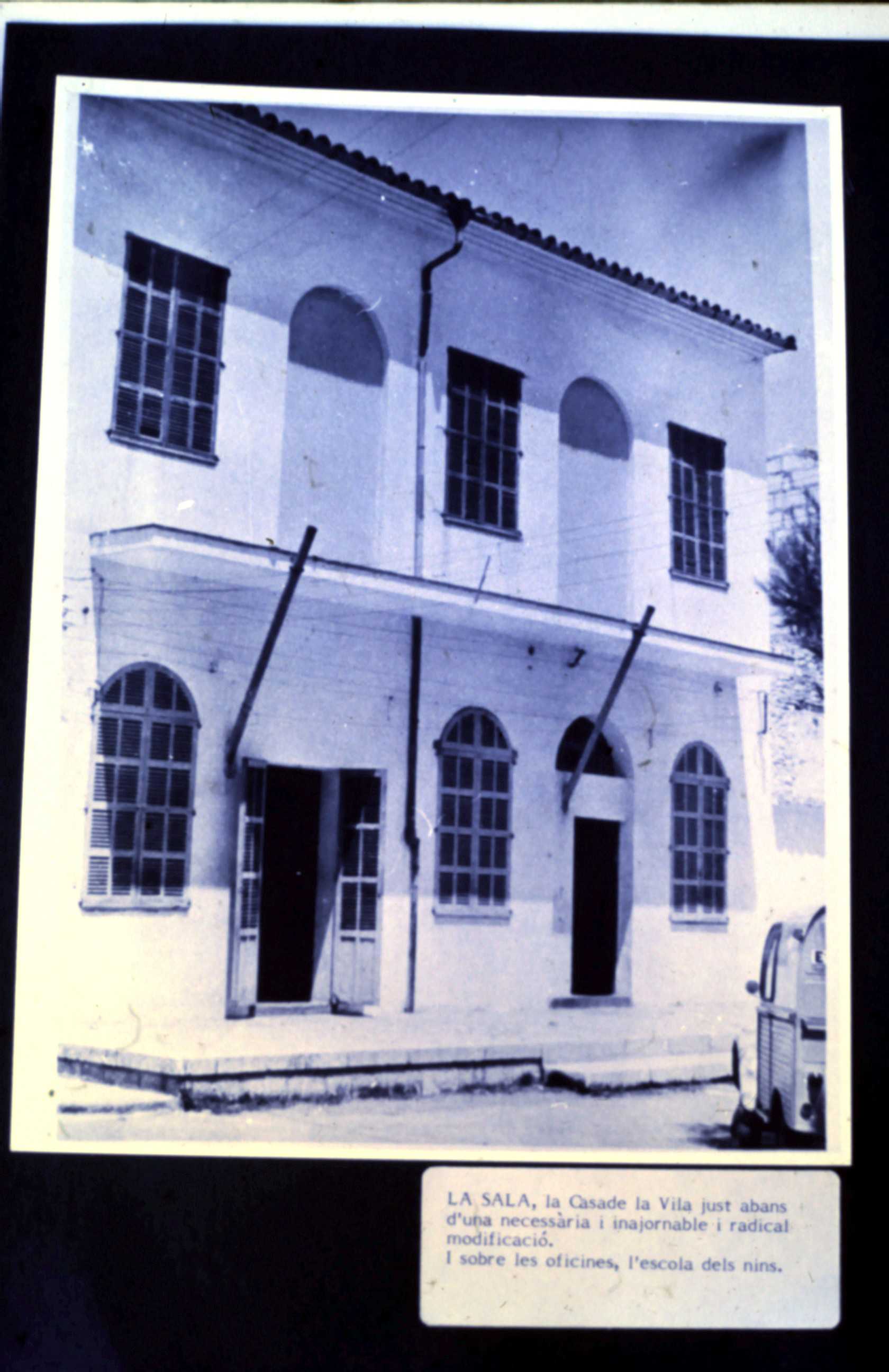 I per finalitzar una imatge de la Sala de fa molts anys. Una façana ben simple i petita que amb el temps ha tornat més moderna i grossa, a pesar de conservar aquest coloret blanc. S’ha de dir que s’hi han invertit diners, a pesar que com diu el cartellet ja feia falta: “La Casa de la Vila just abans d’una necessària, inajornable i radical modificació. I sobre les oficines, l’escola dels nins”.