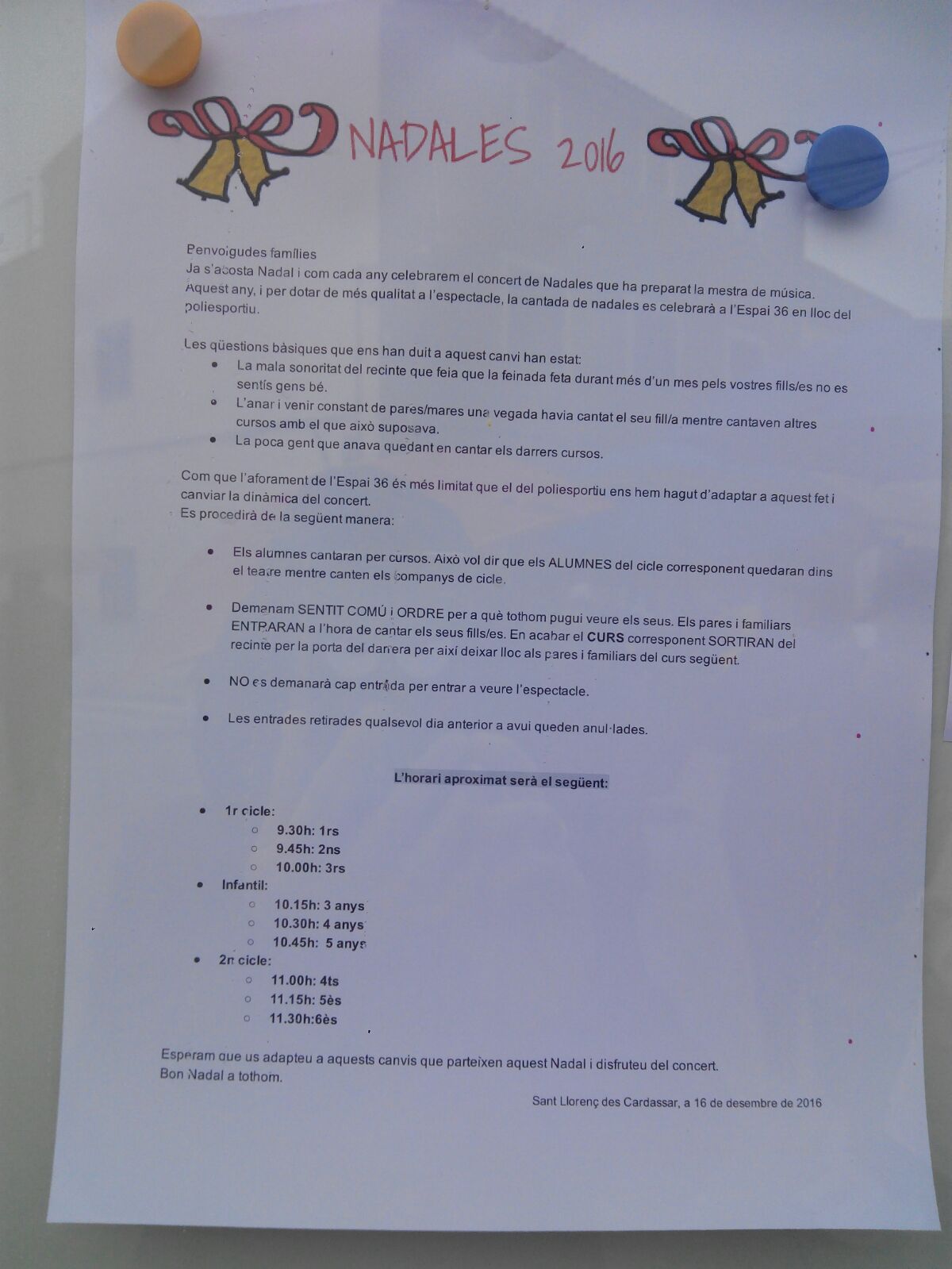 • Pares alçant el crit al cel, barricades a punt de sortir en escena, la nitura generalitzada… Quin sarau que es va muntar, tu, per Sant Llorenç. A partir del rumor que a l’Espai 36 ja no hi havia entrades per a veure els nins cantar les Nadales, el poble va entrar en fallida, així literalment.
