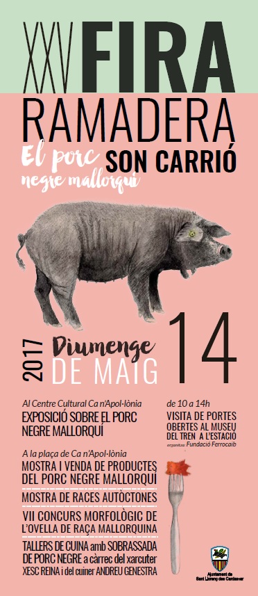 A continuació podeu consultar els diferents actes de la “XXV Fira Ramadera de Son Carrió”, que tendrà lloc el proper diumenge dia 14 de maig. La temàtica principal de la fira d’enguany girarà entorn al porc negre mallorquí.