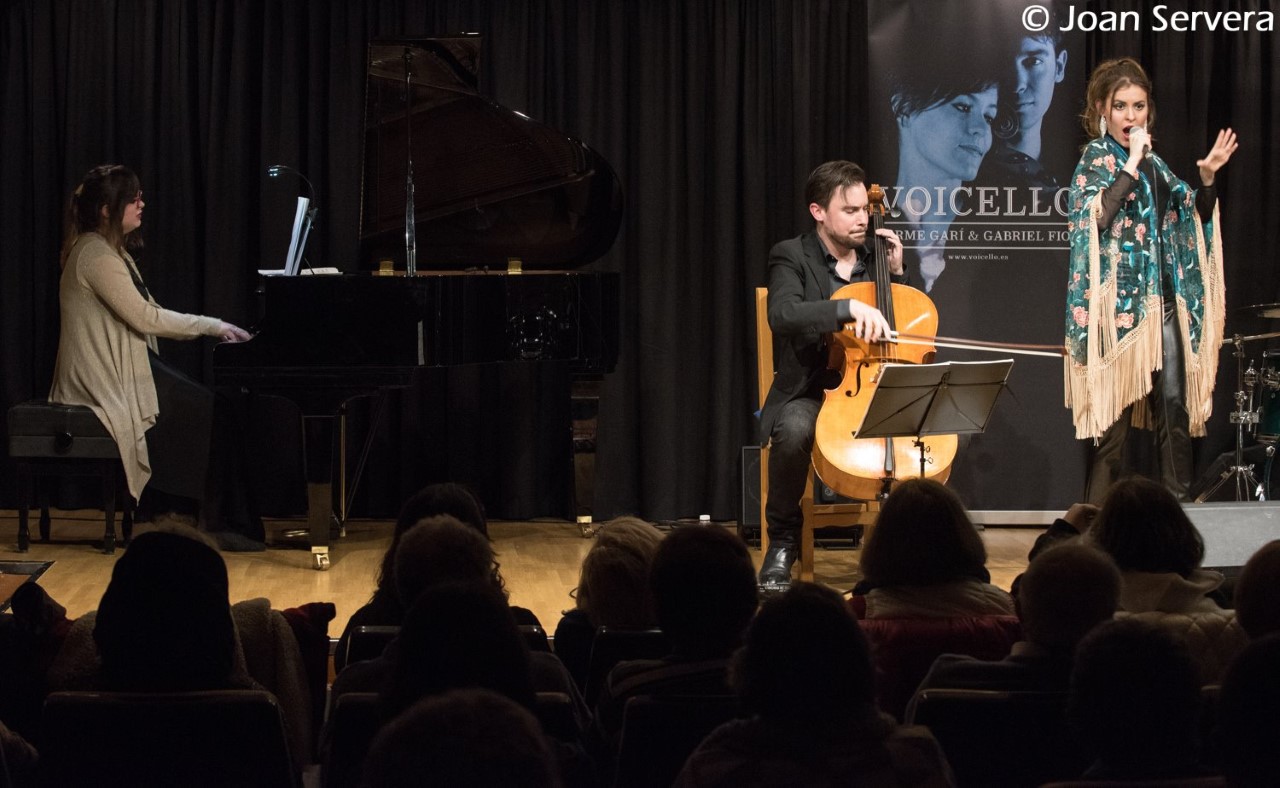 El dissabte dia 14 d’abril, dins els concerts programats a la Setmana de Música de Felanitx, tingué lloc el concert de VOICELLO. Un concert especial sens dubte per al duet format pel felanitxer Gabriel Fiol (violoncel) i Carme Garí (veu), que presentaren el seu nou projecte Crossover Opera Pop, acompanyats a la bateria per Miquel Marquès, i al piano per la germana petita d’en Biel, Marina, que en nom de Voicello va dedicar l’actuació als seus padrins felanitxers i familiars.![]()
