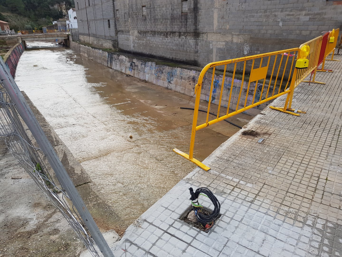 Aquestes imatges mostren a més el problema d’aquesta forma d’actuar, l’endemà qualcú que no hi tenia res a veure amb la decisió del cos de la brigada (o del servei municipal pertinent) va haver d’anar a treure del torrent totes les que hi havien caigut, generant així una pèrdua innecessària de temps i recursos que no hauria calgut si les barreres s’haguéssin col·locat des del primer moment com es va fer al pas del torrent per Son Carrió, o com han fet com podeu veure a la imatge a una de les bandes del pas del torrent pel carrer Major que, sense ser una estructura definitiva ni de lluny, dona com a mínim una mica més d’estabilitat i seguretat.