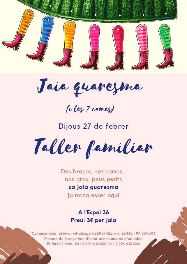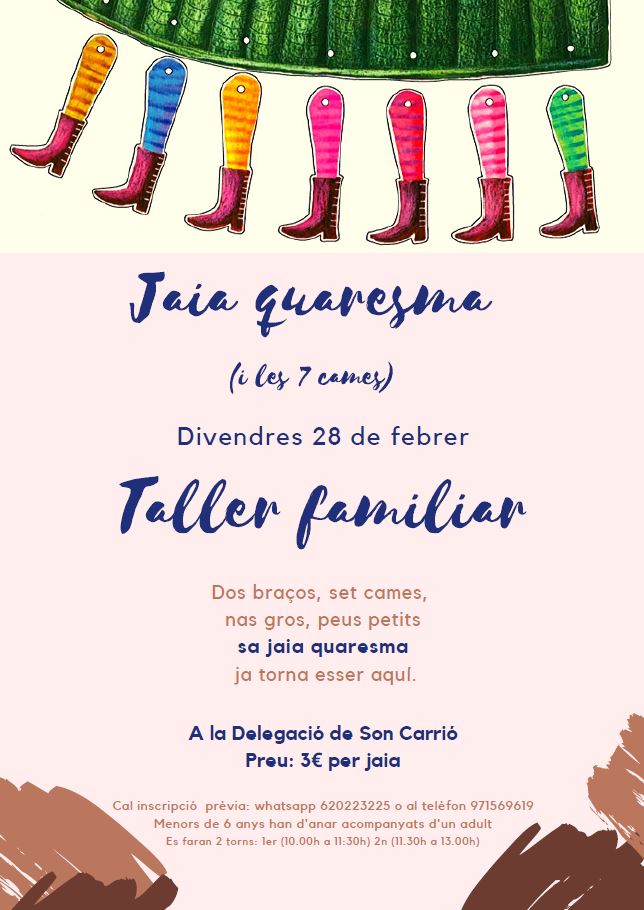 Des del Departament de Cultura de l’Ajuntament de Sant Llorenç vos feim arribar la informació del proper taller familiar: Sa Jaia quaresma (i ses set cames).